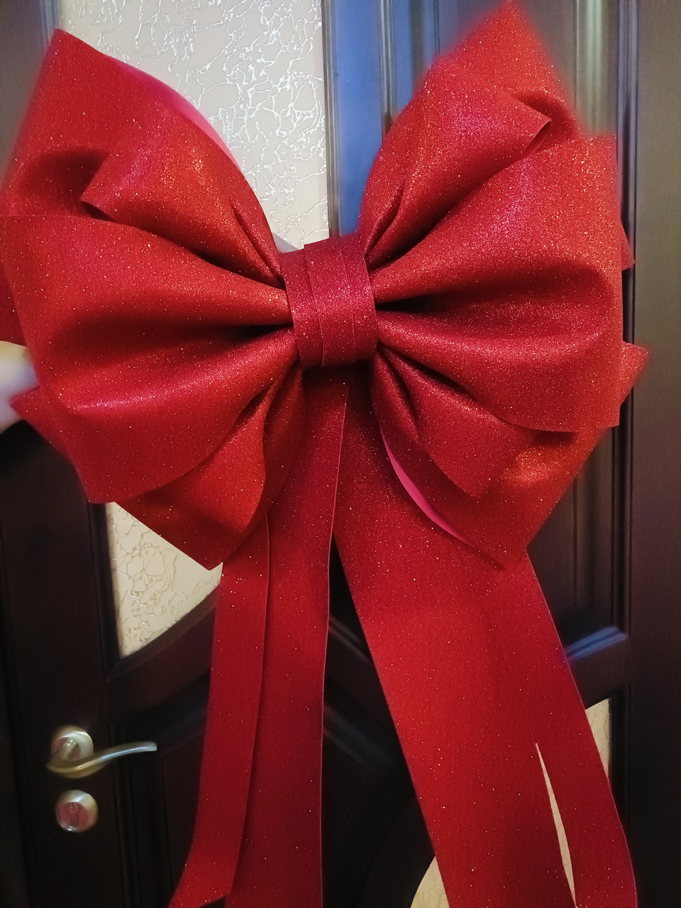 Шикарний бант на двері, виготовлений з вологостійкого матеріалу, можна використовувати на вулиці, розмір 60 см ширина, 80 см довжина разом з лентами, які можна обрізати як вам потрібно.