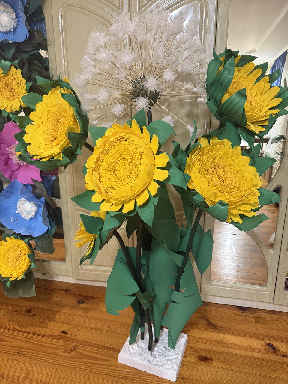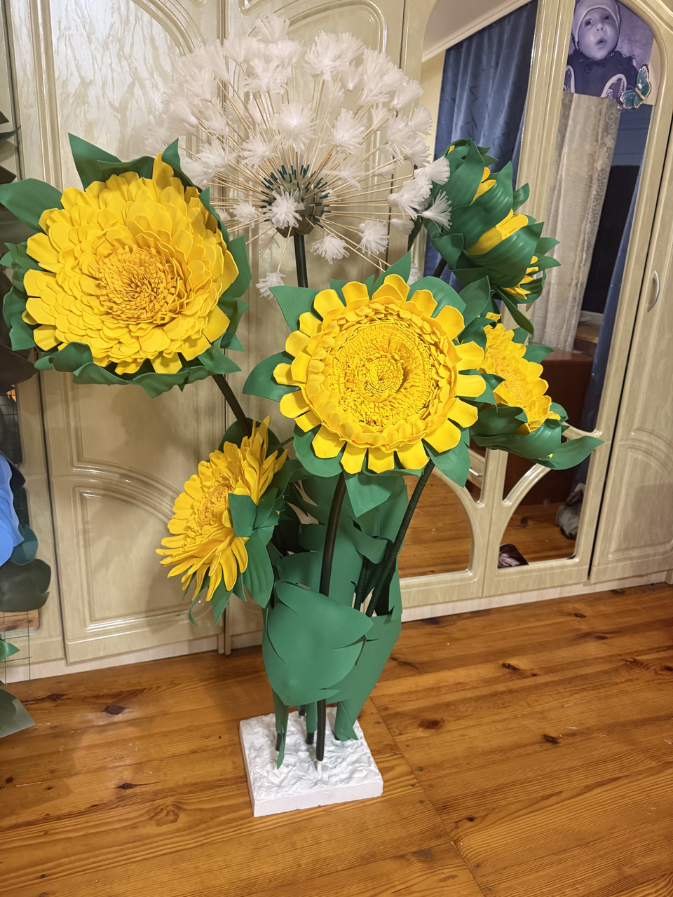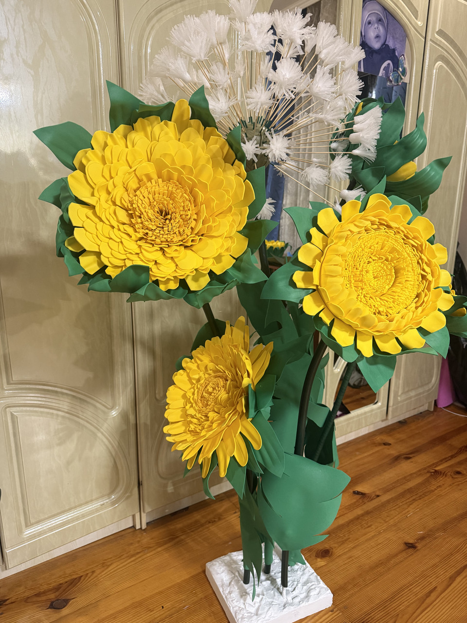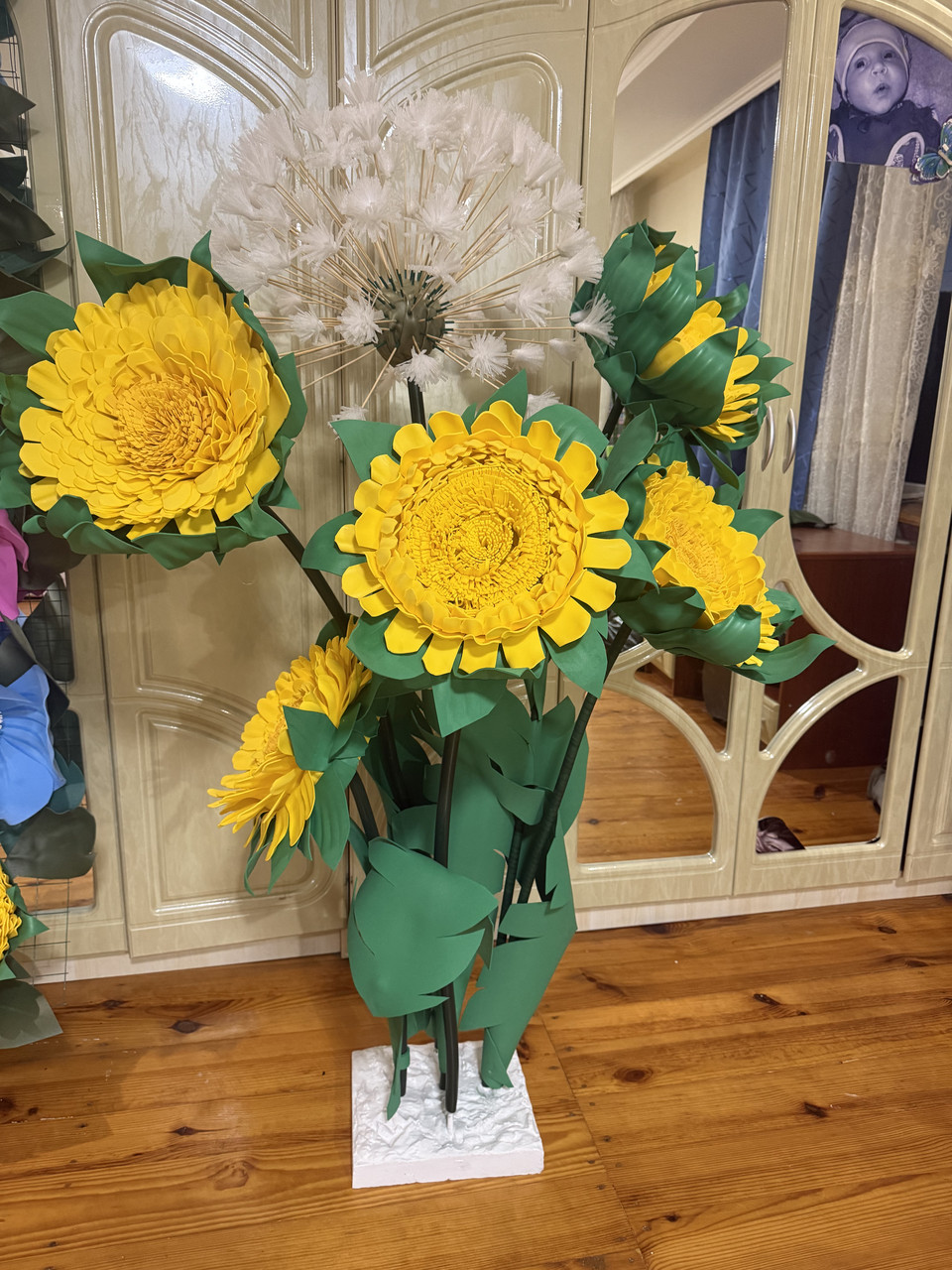 Квіти кульбаби Квіти кульбаби Ростові висота 170 сантиметрів діаметр квітки 50 сантиметрів все разом з підставкою виготовлені з вологостійкого матеріалу- фоамирану