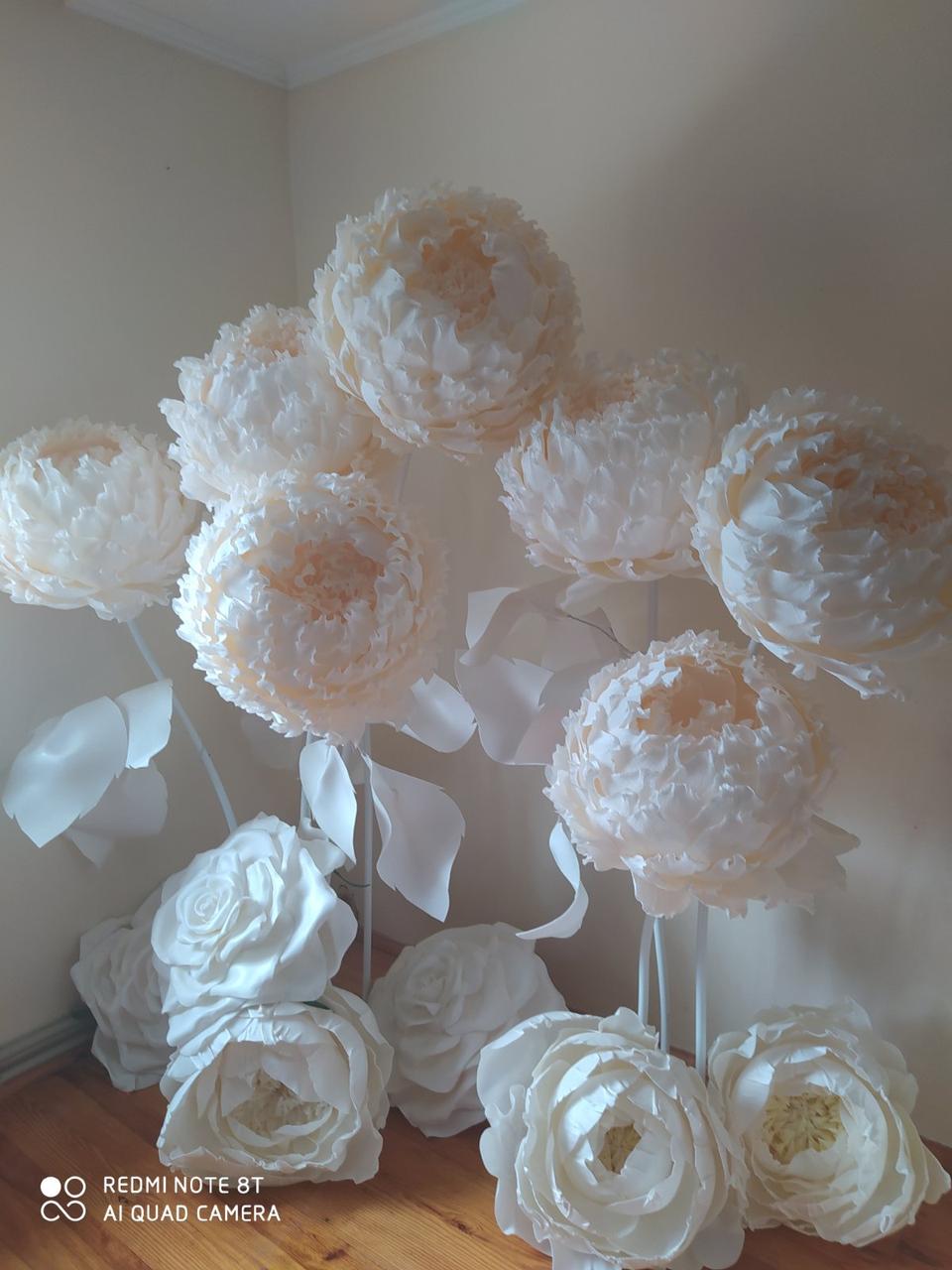 Квіти з гафре паперу, на вулиці використовувати не можна, дощ і вологість погано впливають на форму квітки. В сухому приміщенні зберігаються чудово, послужать 5 років (перевірено особисто), бо робили такі композиції в садочок. Ціна за 1 шт (квітка,стебло, стійка)-1600 грн